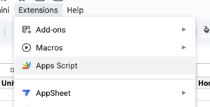 • From the sheet, click Extensions → Apps Script