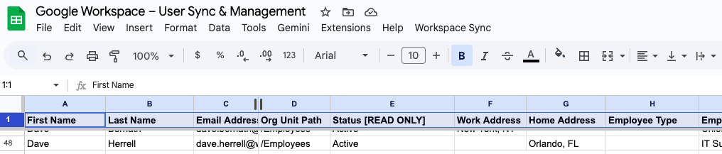 * First Name | Last Name | Email Address | Org Unit Path | Status [READ ONLY] | Work Address | Home Address | Employee Type | Employee Title | Manager Email | Department